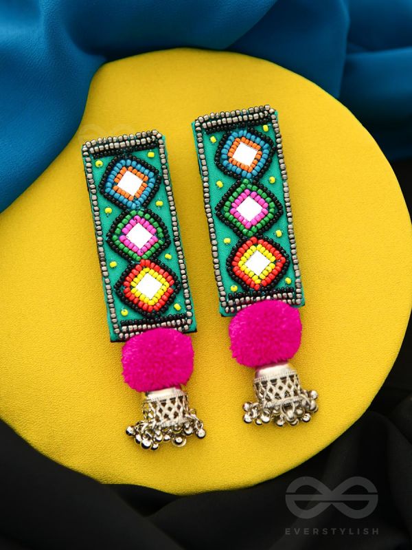 VARNAD- THE COLORFUL- BEADS AND MIRRORS EMBROIDERED EARRINGS (Parakeet Green, Ebony & Fuchsia Pink)