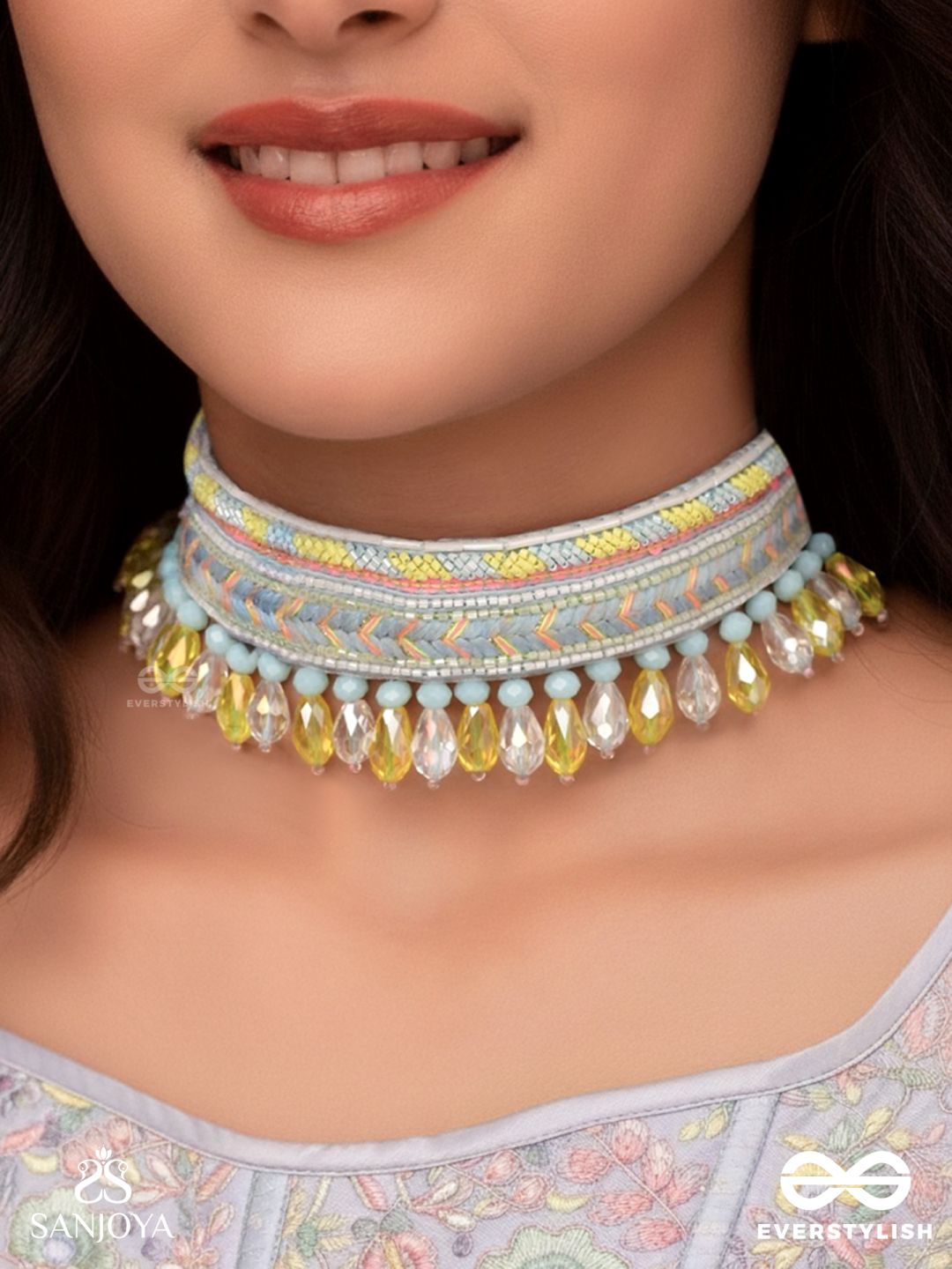 Kelih - Garden Of Sky - Resham, Cutdana And Glass Drops Hand Embroidered Choker Neckpiece