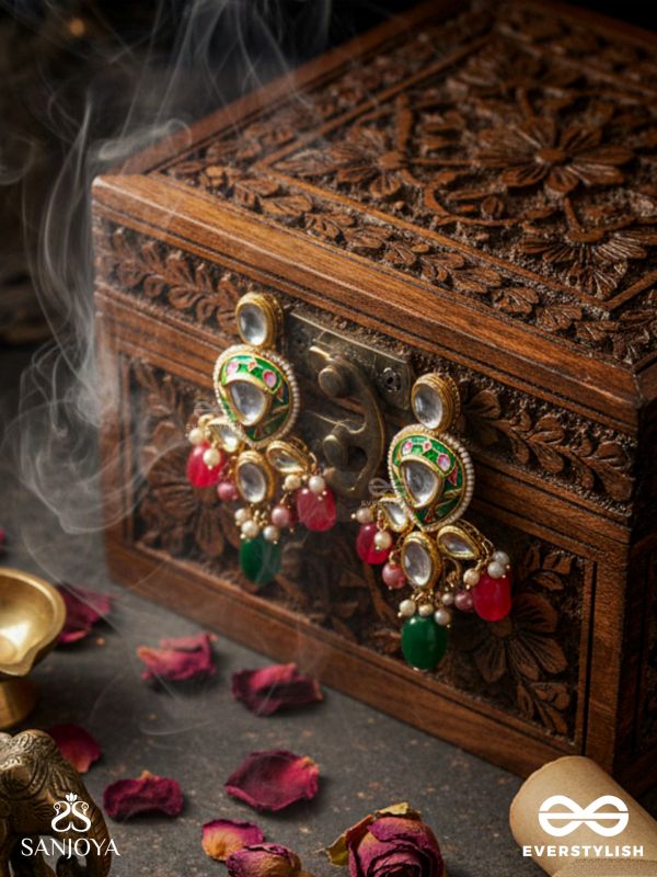 KIRANMALA – GARLAND OF RAYS- EXQUISITE ENAMELLED KUNDAN EARRINGS WITH MULTICOLORED DROPS AND PEARLS