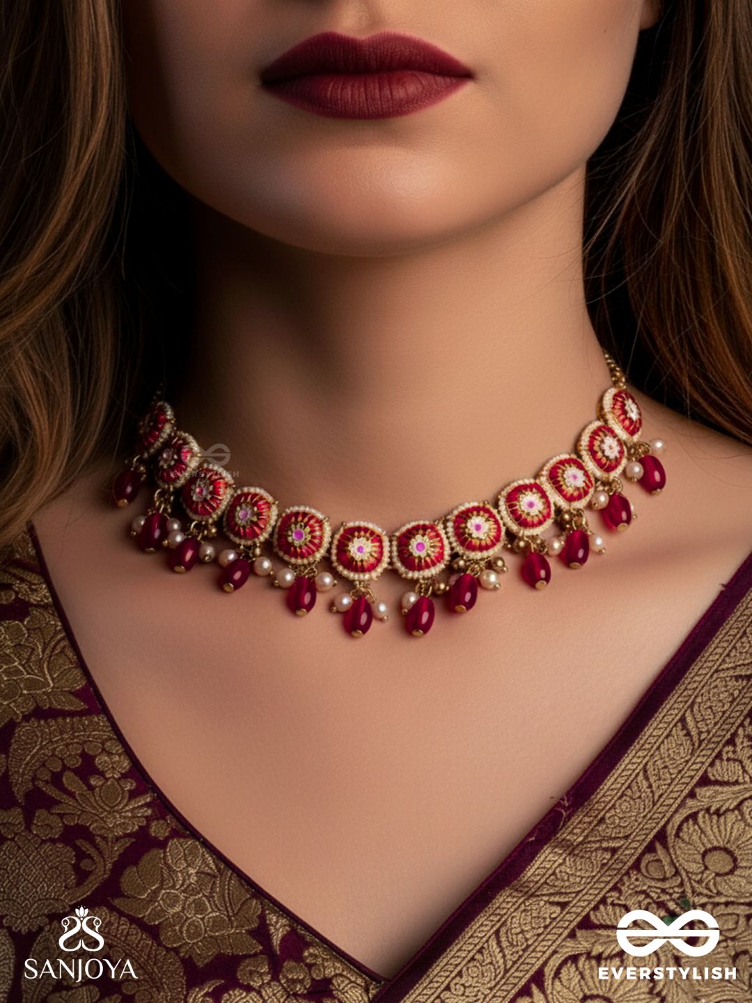 RUDRANJALI - SACRED RED OFFERING- TRADITIONAL RED ENAMELLED POLKI CHOKER WITH LUSTROUS BEADS AND PEARLS