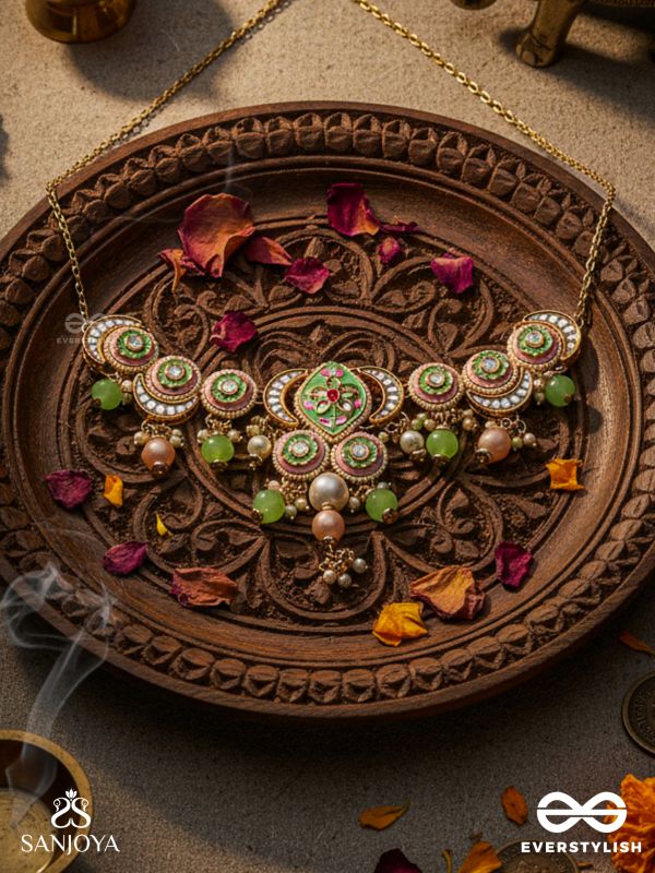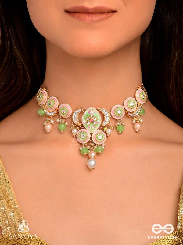 HARITRINA - VERDANT BEAUTY - KUNDAN DAINTY GOLDEN NECKLACE WITH HANDCRAFTED FLORAL ENAMEL WORK