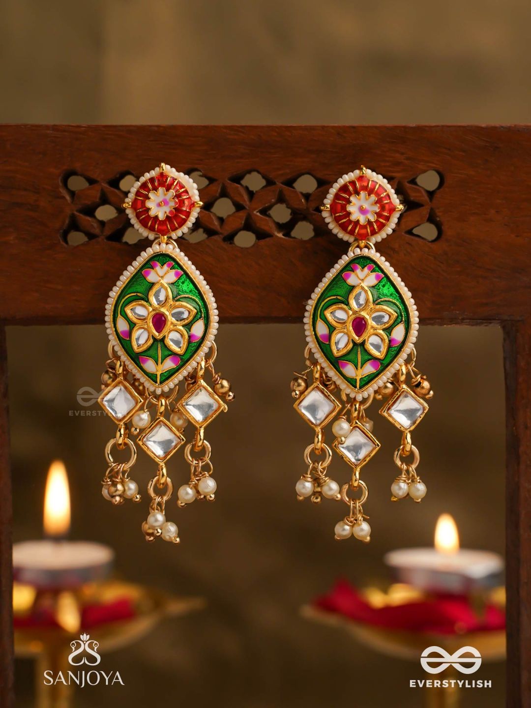 SHRINGARIKA - THE ADORNED ONE- ELEGANT PEARL EARRINGS WITH GREEN ENAMEL DROP, KUNDAN AND BEADS