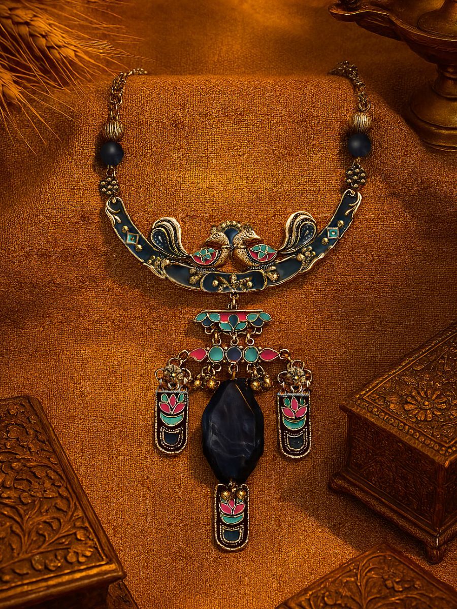 MOON DUSK - ENAMELLED OXIDISED NECKLACE WITH ENGRAVED CHARMS
