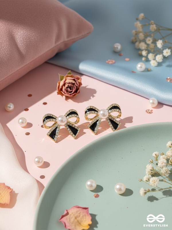 BOW AFFAIR – BLACK HEART BOW DROPS WITH CENTER PEARL